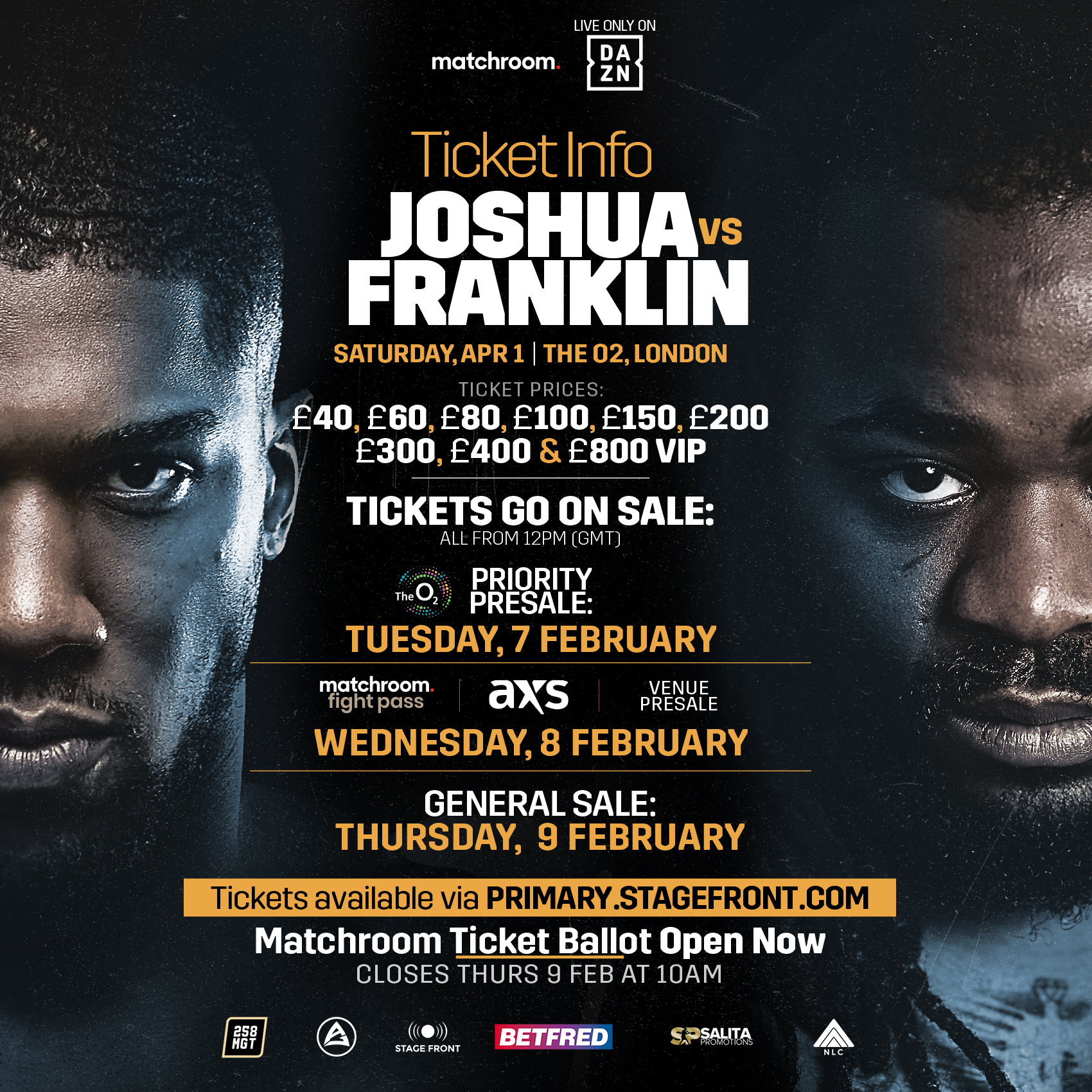Tickets for Joshua vs. Franklin are priced £40, £60, £80, £100, £150, £200, £300, £400 and £800 (VIP).